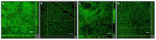 To assess structural changes in the biofilms following laser treatment, fixed samples were stained with 15 μmol/L Sytox Green (Thermo Fisher Scientific, Waltham, MA, USA) and embedded in Mowiol [55]. Biofilm architecture was analyzed by CLSM using a Leica SP8 microscope (Vienna Institute of Biotechnology Imaging Center, University of Natural Resources and Life Sciences, Vienna, Austria). For each treatment group, three stained discs were imaged using a 40× objective. Images were processed and analyzed using software (ImageJ, version 1.53, National Institute of Health, Bethesda, MD, USA).