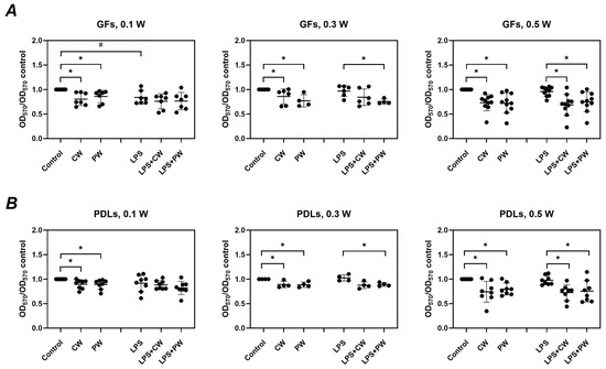 Impact of diode laser treatment on the viability of gingival fibroblasts (GFs) and periodontal ligament cells (PDLs) under different conditions. GFs (A) and PDLs (B) were treated with a diode laser with either a continuous wave (CW) or a pulsed wave (PW) with a power of 0.1, 0.3, or 0.5 W. The cells were further cultured for an additional 24 h in the absence or presence of 1 µg/mL of P. gingivalis lipopolysaccharide (LPS) and 250 ng/ml of soluble CD14, and cell viability was measured using the 3-(4,5-dimethylthiazol-2-yl)-2,5-diphenyltetrazolium bromide (MTT) method. Y-axes show the optical density values measured at 570 nm (OD570) normalized to those of untreated control cultured without LPS. Each point represents the data of cells of one donor measured in technical triplicate, and the bars show the mean value ± standard deviation. *—significantly lower viability upon treatment with the diode laser; #—significantly lower viability after culturing with LPS.