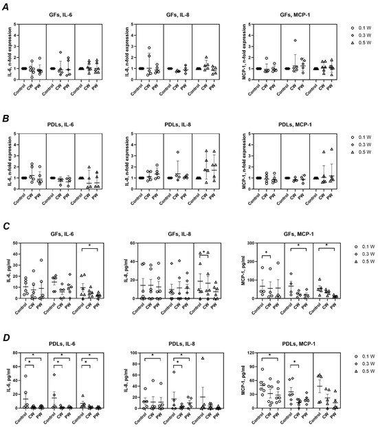 Impact of different diode laser treatments on basal gene expression and protein production of IL-6, IL-8, and MCP-1 by gingival fibroblasts (GFs) and periodontal ligament cells (PDLs). GFs (A,C) and PDLs (B,D) were treated with a diode laser with either a continuous wave (CW) or a pulsed wave (PW) with a power of 0.1, 0.3, or 0.5 W. The cells were further cultured for an additional 24 h, and the gene expression of interleukin (IL)-6, IL-8, and monocyte chemoattractant protein (MCP)-1 (A,B) and the content of corresponding proteins in conditioned media (C,D) were measured by qPCR and ELISA, respectively. Y-axes (A,B) show the n-fold gene expression in relation to the untreated control (no laser) and calculated by the 2−ΔΔCt method. Each point represents the data of cells of one donor measured in technical duplicates. Y-axes (C,D) show the concentration of corresponding proteins measured by ELISA. The bars show mean values ± s.e.m; *—significantly lower gene expression or protein production upon treatment with the diode laser.