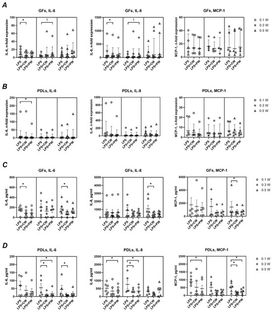 Impact of different diode laser treatments on P. gingivalis LPS-induced gene expression and protein production of interleukin (IL)-6, IL-8, and monocyte chemoattractant protein (MCP)-1 by gingival fibroblasts (GFs) and periodontal ligament cells (PDLs). GFs (A,C) and PDLs (B,D) were treated with a diode laser with either a continuous wave (CW) or a pulsed wave (PW) with a power of 0.1, 0.3, or 0.5 W. The cells were further cultured for an additional 24 h in the presence of 1 µg/ml of P. gingivalis lipopolysaccharide (LPS) and 250 ng/mL soluble CD14, and the gene expression of IL-6, IL-8, and MCP-1 (A,B) and the content of corresponding proteins in conditioned media (C,D) were measured by qPCR and ELISA, respectively. Y-axes (A,B) show the n-fold gene expression in relation to untreated control (no laser) and calculated by the 2−ΔΔCt method. Each point represents the data of cells of one donor measured in technical duplicates. Y-axes (C,D) show the concentration of corresponding proteins measured by ELISA. The bars show mean values ± s.e.m; *—significantly lower gene expression or protein production upon treatment with the diode laser. †—significantly higher gene expression upon treatment with the diode laser.
