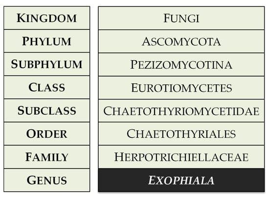 The genus Exophiala was described in 1966 by J.W. Carmichael, with Exophiala salmonis designated as the type species []. Exophiala species belong to black yeast-like fungi (BYF) and are classified within the family Herpotrichiellaceae, order Chaetothyriales, class Eurotiomycetes, phylum Ascomycota (Figure 1).