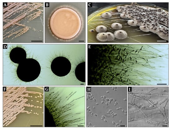 Macro- and microscopic morphology of Exophiala dermatitidis. (A) Colony morphology on YPD agar after 3 days at 24 ± 2 °C, showing a moist, yeast-like texture with a glossy surface and defined margins (scale bar = 10 mm). (B) Colony formed by spot-inoculation of 5 µL cell suspension on YPD agar after 3 days at 24 ± 2 °C (scale bar = 1 mm). (C) Mature colony on YPD agar after 7 days at 24 ± 2 °C, displaying a suede-like, domed surface with gray aerial hyphae and black pigmentation (scale bar = 5 mm). (D) Enlarged view of colonies from panel (A) under transmitted light, revealing filamentous margins with radiating hyphae (scale bar = 100 µm). (E) Conidiogenesis at colony edge, showing tapering annellides with ellipsoid conidia (scale bar = 100 µm). (F) Colony growth on YPD agar after 3 days at 37 ± 2 °C, with markedly reduced aerial hyphal development and predominance of yeast-like morphology (scale bar = 10 mm). (G) Close-up of colony margin from panel (F), illustrating sparse hyphal elements and budding cells (scale bar = 100 µm). (H) Blastoconidia observed in early culture under DIC (scale bar = 10 µm). (I) Mature septate hyphae and annellidic conidiogenous cells from panel (C) visualized with DIC (scale bar = 10 µm). For more morphological details, see Appendix A.2. All images represent isolate E. dermatitidis 7U2 (isolated by A. Piecuch, unpublished). Panels (A–C,F) photographed by M. Parol; panels (D,E,G–I) are by J. Suchodolski.