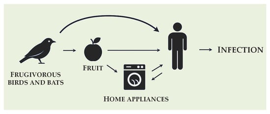 The natural reservoirs and transmission routes of E. dermatitidis remain unclear. However, its presence in wild fruits, frugivorous birds, and human environments suggests a possible ecological link. Based on the reviewed literature, we propose a hypothetical transmission pathway in Figure 3.
