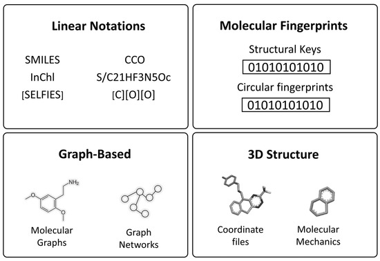 | PubChem https://pubchem.ncbi.nlm.nih.gov/ (accessed on 7 April 2025) | Open chemical resource for chemical structures, properties, bioassays, and literature | 119 M compounds, 330 M substances, 297 M bioactivities | Physicochemical properties, SMILES, InChI, bioassay results, substances metadata | k-NN, RF, SVM | Transformers, GNN | Largest public chemical repository, rich with biological links | Variable data quality, inconsistent annotations, extensive HTS noise |