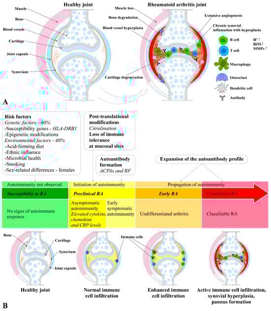 A comparison between healthy and RA joints and RA establishment. (A) Due to immune activation, joint swelling is observed, resulting in synovial inflammation, synovial hypertrophy (pannus) formation, osteoclast activation, extensive angiogenesis, bone and cartilage erosion, joint space narrowing, joint structure destruction, and muscle loss. Increased levels of metalloproteinases (MMPs) and reactive oxygen species (ROS) and a decrease in pH are observed as well. The key players are accumulated cells of innate and adaptive immune systems, including T cells, dendritic cells, B cells, macrophages, and osteoclasts. The establishment of RA (B). Multiple risk factors (genetic and non-genetic) are required to achieve the threshold for triggering RA. Years before the first instance of subclinical synovitis (inflammation of the synovium) and clinical symptoms, disease progression involves the initiation and propagation of autoimmunity against modified self-proteins. Therefore, once established, RA can be classified according to clinical symptoms.