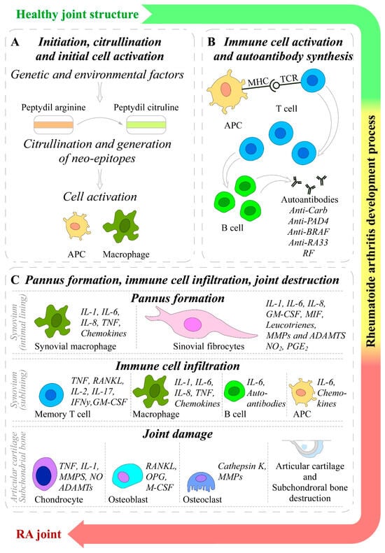 Rheumatoid arthritis has a complex pathogenesis, and the activation of cells of both innate and adaptive immunity and aberrant cytokine production are the main events responsible for the generation and development of pathological immune response. Consequently, synovial inflammation leading to massive destruction of cartilage and bone structures is observed. The pathogenesis of RA involves a diverse array of effector cells, including T cells, B cells, macrophages, and fibroblasts, each contributing to the inflammatory milieu and tissue damage observed in affected individuals [,].