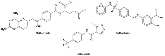 Glucocorticoids (GCs) are the most widely used anti-inflammatory drugs in the field of rheumatology. Intra-articular injections are used to treat acute disease flares, but this type of treatment has been associated with severe adverse reactions. To prevent this, low-dose oral GCs should be used only for short-term pain relief []. For long-term control of inflammation, csDMARDs treatment should be started as soon as rheumatoid arthritis is diagnosed. The chemical structures of some of the main csDMARDs are presented in Figure 3.