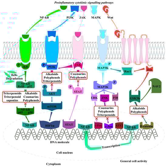 Rheumatoid arthritis is often regarded as incurable, and currently, no adequate treatment is available []. Current treatments aim to control inflammation and pain, contributing to patients’ symptom relief and therefore avoiding or minimizing joint destructive processes []. The current treatment of RA mostly relies on conventional/non-biological disease-modifying anti-rheumatic drugs (cDMARDs), analgesics, non-steroidal anti-inflammatory drugs (NSAIDs), glucocorticoids (GCs), steroids, immunosuppressants, and biologic DMARDs (bDMARDs) [,,]. However, in most cases, the drugs need to be accepted weeks or months before they have any effect, and they may cause liver and bone marrow toxicity, certain malignance, and/or have opportunistic effects [,]. Patients are considered as “difficult to treat” or “refractory” to RA, and although targeted synthetic DMARDs have been introduced, RA treatment is still a great therapeutic challenge, and a considerable amount of patients remain symptomatic []. Along with side effects, such as drug toxicity and intolerance, these anti-rheumatic drugs possess limited efficacy; therefore, novel multi-target therapeutics with an improved safety profile are in high demand, and this is in the interest of both patients and clinicians. The use of plant-derived remedies offers several potential advantages such as anti-inflammatory and immunomodulatory properties, potential pain relief, and the possibility of reducing reliance on conventional medications. However, several factors regarding its effectiveness and safety should be regarded, particularly possible interactions with conventional medications. Other considerations include challenges with bioavailability, metabolism, and the standardization of herbal remedies []. Plant-derived extracts, nutritional supplements, dietary medicine, and molecules with anti-inflammatory activity represent promising adjuvant agents or alternatives for RA therapeutics []. The pathogenesis of RA is tightly related to many characterized signaling pathways, and research attention has focused on discovering plant-derived molecules that function as inhibitors of RA-linked signaling systems [].