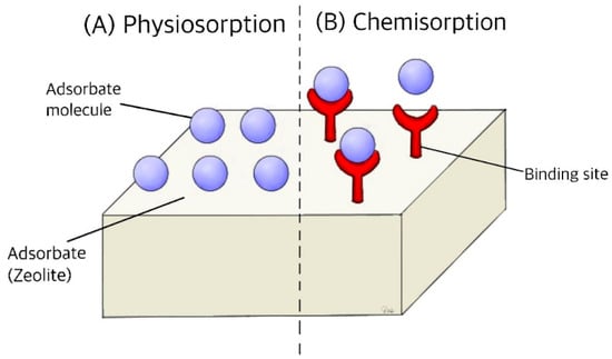 Zeolites function via two primary adsorption mechanisms: (A) Physisorption: Weak intermolecular forces allowing reversible adsorption, useful in drug delivery [2]. The adsorbate molecule, such as a drug, weakly binds to the surface of the zeolite to allow for a reversible reaction. (B) Chemisorption: Stronger interactions enable selective toxin removal and biosensor applications [2]. Covalent or ionic bonds form on the surface of the zeolite through a binding site.