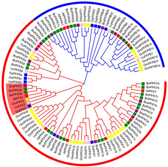 Phylogenetic relationships of the PFK proteins family in Arabidopsis thaliana. The phylogenetic tree was constructed using the Neighbor-Joining (NJ) method in MEGA11 software, with 1000 bootstrap replicates to assess support. In this tree, the PFK2 protein sequences from Arabidopsis thaliana were compared with PFK proteins from rice, grape, soybean, Chinese cabbage, and rapeseed. The outer rings, colored differently, represent the various species: red squares indicate Arabidopsis, blue squares represent rice, pink squares denote grape, yellow squares correspond to soybean, purple squares signify Chinese cabbage, and green squares represent rapeseed. This tree clearly illustrates the evolutionary relationships and functional divergence of the PFK protein family in Arabidopsis thaliana across different species.