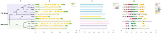 Features of the PFK genes in Arabidopsis thaliana. (A) A Neighbor-Joining (NJ) phylogenetic tree was constructed using MEGA11 software based on the full-length sequences of Arabidopsis thaliana PFK proteins. The tree’s reliability was assessed using 1000 bootstrap replicates. (B) Schematic representation of the gene structure of Arabidopsis thaliana PFK genes. Different colors correspond to various domains. Introns are shown as grey lines, exons as yellow rectangles, and untranslated regions (UTRs) as green rectangles. The scale bar represents 1 kb. (C) The domains of Arabidopsis thaliana PFK proteins. (D) Distribution of conserved motifs across Arabidopsis thaliana PFK proteins. Different colored boxes represent motifs 1–10, with a scale bar provided at the bottom.