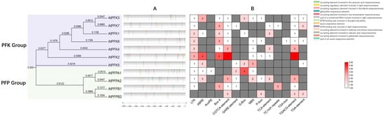 cis-acting elements in the promoters of Arabidopsis thaliana PFK genes. (A) Putative stress- and hormone-related cis-acting elements in the promoter regions of Arabidopsis thaliana PFK genes. These cis-acting elements were identified within the 2000-bp upstream promoter regions using the PlantCARE database. (B) Heatmap showing the distribution of putative stress-and hormone-related cis-acting elements. The names of the cis-acting elements are listed at the bottom of the figure, with numbers in the squares indicating the quantity of each element. Grey squares represent the absence of the element (quantity = 0).