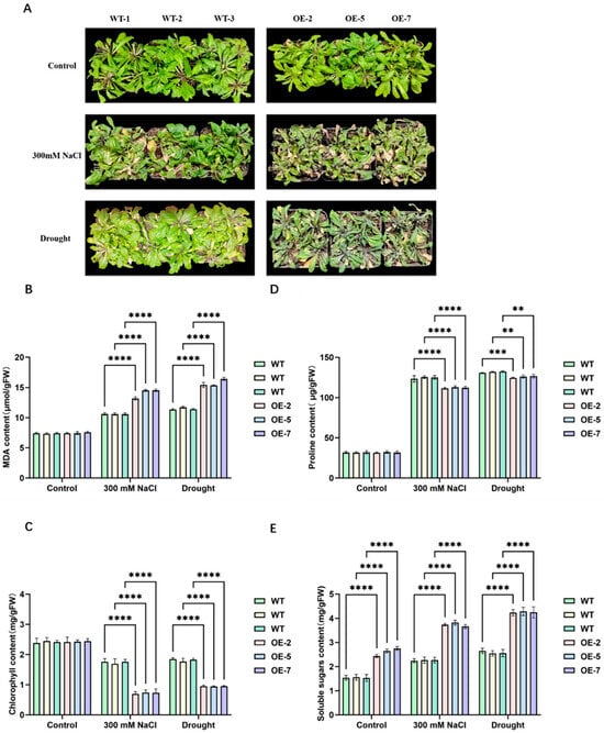 To further explore the role of AtPFK2 in stress tolerance, we generated ten independent transgenic Arabidopsis lines overexpressing AtPFK2. From these, three representative overexpressing lines (OE-2, OE-5, and OE-7), which showed elevated transcript levels (Figure S4), were selected for detailed functional analysis. Three-week-old plants of both the AtPFK2-overexpressing (OE) and wild-type (WT) lines were subjected to either 300 mM NaCl irrigation or dehydration for seven days. Under normal watering conditions, there were no visible phenotypic differences between the OE and WT lines. However, after stress treatment, the differences became apparent. Wild-type plants exhibited moderate leaf wilting and partial chlorosis in the rosette leaves, whereas AtPFK2-overexpressing (OE) lines showed more severe wilting and extensive chlorosis (Figure 4A), suggesting that overexpression of AtPFK2 increased stress sensitivity. Physiological analyses revealed that, compared to WT plants, the OE lines had significantly lower chlorophyll and proline contents under both salt and drought stresses (Figure 4C,D). In contrast, malondialdehyde and soluble sugar levels were elevated in the OE lines (Figure 4B,E). These findings indicate that AtPFK2 overexpression compromises stress tolerance in Arabidopsis, making the transgenic plants more susceptible to both NaCl and drought stresses. This discovery not only enhances our understanding of AtPFK2’s role in stress adaptation and metabolic regulation but also provides a theoretical framework for the potential genetic improvement of crop stress tolerance through targeted manipulation of PFK2-mediated pathways.