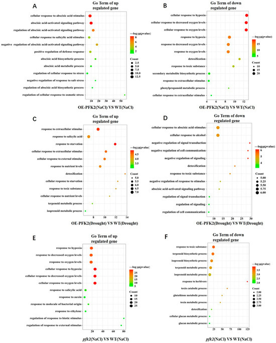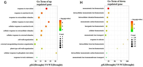 GO Enrichment analysis of core differentially expressed genes (DEGs) in wild-type (WT), AtPFK2-overexpression (OE), and pfk2 mutant (T-DNA) lines under salt and drought stress. (A–H) show the twelve most significantly enriched biological processes for upregulated and downregulated genes. In these figures, the vertical axis represents various biological processes, and the horizontal axis displays the enrichment factor. The size of the dots corresponds to the number of enriched genes, while the color of the dots indicates the enrichment significance, represented by −log10(p-value).