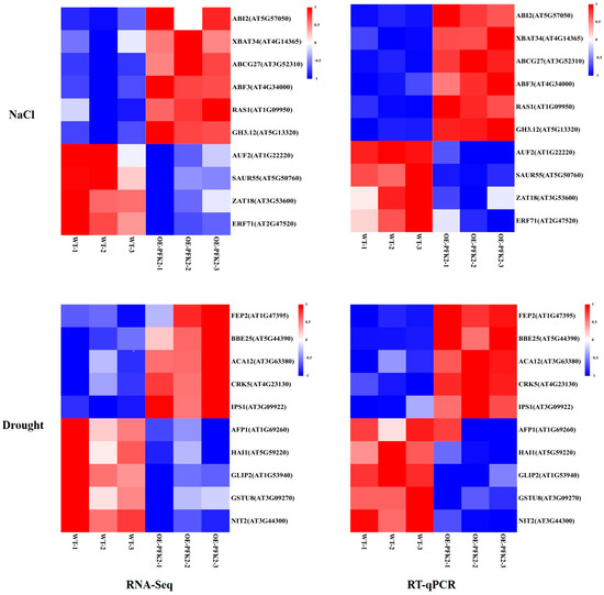 RT-qPCR validation of key genes in wild-type (WT) and AtPFK2-overexpression (OE) lines. The gene names and IDs are labeled on the right. The left panel displays the RNA-Seq results under salt and drought stress, while the right panel shows the RT-qPCR results under the same conditions. Both wild-type (WT) and AtPFK2-overexpression (OE) lines were analyzed in triplicate, with Actin used as the reference gene.