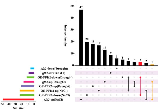 Wild-type (WT) and AtPFK2-overexpressing (OE) transgenic Arabidopsis seedlings were vertically grown on 1/2 MS (Murashige and Skoog) medium for 14 days, then transferred to soil for another 8 days. The plants were treated with 300 mM NaCl and water-withholding treatments for 7 days. Samples were collected on day 3 of treatment and stored at −80 °C for RNA extraction. Wild-type (WT) Arabidopsis seedlings were collected after 6 h of NaCl and drought treatment for RT-qPCR analysis of PFK and PFPs genes. Total RNA was extracted using the RNAprep Pure Plant Kit (TIANGEN, Beijing, China). RNA-Seq libraries were prepared using the TruSeqTM RNA Sample Prep Kit (Illumina, San Diego, CA, USA), and sequencing was performed on an Illumina platform. Sequences were aligned using HISAT2, transcript assembly was conducted with StringTie (v2.2.3), and differential expression analysis was performed using DESeq2. Transcriptional profiles of the AtPFK2 gene were analyzed using heatmaps, bubble plots, and upset plots. Quantitative real-time PCR (qRT-PCR) was conducted using the Bio-Rad CFX Connect system (Bio-Rad, Hercules, CA, USA)with the Arabidopsis Actin gene as the reference. Each sample was analyzed in three technical replicates and three biological replicates.