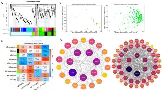 WGCNA analysis of AtPFK2-overexpression lines under salt and drought stress. (A) The gene dendrogram for the entire transcriptome profile was constructed using average linkage hierarchical clustering, where each branch represents a gene. The module assignments from the dynamic tree cut are shown in the module colors beneath the dendrogram. (B) Correlation between module feature genes and different genotypes. The color of each module corresponds to the color in panel (A). Genotypes for each module are displayed at the bottom of the module names. The correlation coefficient and p-value are shown in each cell. (C) Scatter plot of gene significance versus module membership for the deep yellow and green modules. (D) Co-expression network of the deep yellow and green module members. Each node represents a gene or protein, and the connections between nodes indicate their interactions. The strength or number of connections may reflect the intensity or type of interactions. The color of each node may represent different categories or groups, and the size of the node may indicate the importance or activity of a gene or protein, or the number of interactions with other genes/proteins.