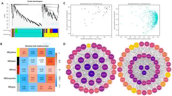 After constructing the weighted gene co-expression network analysis (WGCNA) and screening for differentially expressed genes (DEGs), we built a co-expression network of the DEGs using R software (4.4.2) and the WGCNA (v1.71) package, based on the gene expression profile matrix. To ensure a scale-free network distribution, the weight parameter power of the adjacency matrix was optimized. Power values were tested in the range of 1–30, and the correlation coefficients and average connectivity for networks corresponding to each power value were calculated. A higher correlation coefficient (with a maximum of 1) indicates that the network is closer to a scale-free distribution, while maintaining adequate gene connectivity. Therefore, we selected a power value that resulted in a sufficiently high correlation coefficient while preserving strong gene connectivity. Ultimately, we chose power = 30 to construct the neighbor connectivity matrix between genes and applied the topological overlap matrix similarity algorithm to transform this matrix into a topological overlap matrix. Based on the selected power of 30, a weighted co-expression network model was established, grouping 1627 genes and 1495 genes into 9 and 5 modules, respectively. The grey module (Grey) represents genes that cannot be assigned to any module and holds no significant reference value. These modules were then correlated with sample traits, and the correlation between each module and sample traits was calculated. After identifying significantly correlated modules, we performed GO and KEGG annotation and enrichment analyses on the genes within these modules. Finally, candidate core genes were visualized using Cytoscape 3.10.3 software, and the degree of each gene was calculated using the Centiscape 2.2 plugin to visualize the co-expression network. Node size was proportional to the degree, and genes with the highest degree were selected as hub genes.
