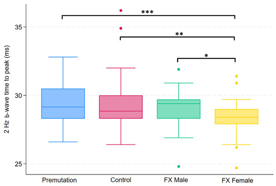 Boxplot illustrating group differences in 2 Hz b-wave time to peak (ms) among premutation carriers, controls, and individuals with Fragile X syndrome (FX males and FX females). Kruskal–Wallis tests identified significant overall differences (p = 0.0164). Pairwise comparisons were conducted using Dunn’s post hoc test, with p-values adjusted using the Benjamini–Hochberg procedure to control the false discovery rate. Asterisks indicate significant pairwise comparisons: p < 0.05 (*), p < 0.01 (**), p < 0.001 (***).