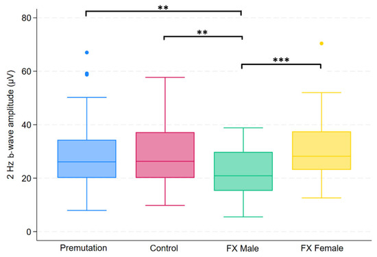 Boxplot illustrating group differences in 2 Hz b-wave amplitude (µV) among premutation carriers, carriers, and individuals with Fragile X syndrome (FX males and FX females). Kruskal–Wallis tests identified significant overall differences (p = 0.0081). Pairwise comparisons were conducted using Dunn’s post hoc test, with p-values adjusted using the Benjamini–Hochberg procedure to control the false discovery rate. Asterisks indicate significant pairwise comparisons: p< 0.01 (**), p < 0.001 (***).