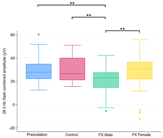 Boxplot illustrating group differences in 28.3 Hz flash combined amplitude (µV) among premutation carriers, controls, and individuals with Fragile X syndrome (FX males and FX females). Kruskal–Wallis tests identified significant overall differences (p = 0.0139). Pairwise comparisons were conducted using Dunn’s post hoc test, with p-values adjusted using the Benjamini–Hochberg procedure to control the false discovery rate. Asterisks indicate significant pairwise comparisons: p < 0.01 (**).