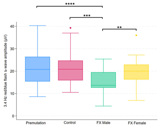 Boxplot illustrating group differences in 3.4 Hz red/blue flash b-wave amplitude (µV) among premutation carriers, carriers, and individuals with Fragile X syndrome (FX males and FX females). Kruskal–Wallis tests identified significant overall differences (p = 0.0026). Pairwise comparisons were conducted using Dunn’s post hoc test, with p-values adjusted using the Benjamini–Hochberg procedure to control the false discovery rate. Asterisks indicate significant pairwise comparisons: p < 0.01 (**), p < 0.001 (***), p < 0.0001 (****).