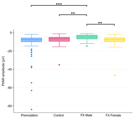 Boxplot illustrating group differences in PhNR amplitude (µV) among premutation carriers, controls, and individuals with Fragile X syndrome (FX males and FX females). Kruskal–Wallis tests identified significant overall differences (p = 0.0026). Pairwise comparisons were conducted using Dunn’s post hoc test, with p-values adjusted using the Benjamini–Hochberg procedure to control the false discovery rate. Asterisks indicate significant pairwise comparisons: p < 0.01 (**), p < 0.001 (***).