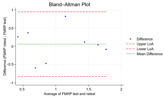 A two-way random-effects ICC model assessing absolute agreement between the FMRP test and retest yielded an individual ICC of 0.702 and an average ICC of 0.825, indicating good to very good reliability. Average ICC denotes the reliability of the average of the FMRP test and retest in reflecting the true score. The ICC was statistically significant (p = 0.014), suggesting that the observed agreement is unlikely due to chance. The Bland–Altman plot of absolute differences in FMRP measurements shows minimal mean bias (mean difference ~−0.14), indicating no systematic over- or underestimation between test and retest (see Figure 6). The limits of agreement (approximately −1.04 to +0.77) indicate that most values fall within acceptable bounds, supporting good test–retest reliability. [Interpretation of Intraclass Correlation: ICC < 0.40 = poor reproducibility, 0.40 ≤ ICC < 0.75 = fair to good reproducibility, ICC ≥ 0.75 = excellent reproducibility] [28].