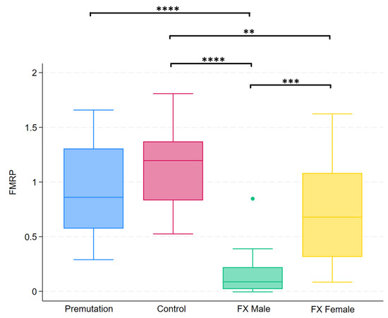 Boxplots illustrating group differences in FMRP levels among premutation carriers, controls, and individuals with Fragile X syndrome (males and females). Kruskal–Wallis tests identified significant overall differences between groups. Pairwise comparisons were conducted using Dunn’s post hoc test. Asterisks indicate significant pairwise comparisons: p < 0.01 (**), p < 0.001 (***), p < 0.0001 (****).
