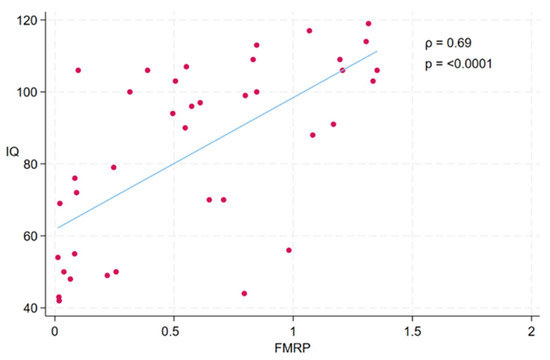 A statistically significant strong positive correlation between FMRP levels and IQ scores was observed in the study participants (ρ = 0.69, p < 0.0001) (see Figure 8). Participants with higher FMRP levels tend to have higher IQ scores.