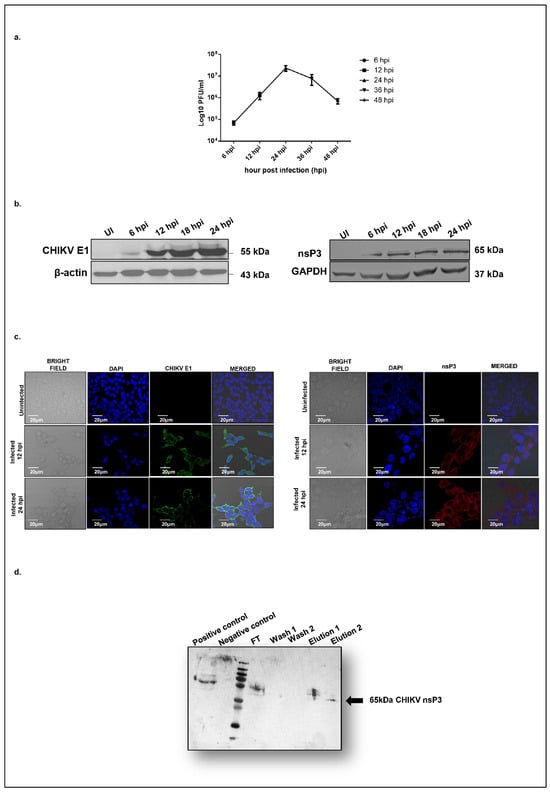 Co-Immunoprecipitation of CHIKV-nsP3 interacting partners in liver-derived Huh7 cells. (a) A plaque assay was performed to estimate the change in the virus titer in the culture filtrate of Huh7 cells during the time course of infection at 6, 12, 24, 36, and 48 hpi. (b) Western blot depicting the change in the expression pattern of CHIKV E1 and CHIKV-nsP3 protein at 6, 12, 18, and 24 hpi where uninfected cell lysate served as a control. (c) The immunofluorescence assay shows the distribution and expression of CHIKV E1 and CHIKV-nsP3 proteins in infected Huh7 cells at 12 and 24 hpi. Uninfected cells were used as a control. Nuclei are stained with DAPI (blue), and CHIKV E1 protein with Alexa Fluor 488 (green) and CHIKV nsP3 protein with Alexa Fluor 594 (red). scale bar, 10 μm. (d) Immunoblot detection of the CHIKV-nsP3 protein at an expected molecular weight of 65 kDa in Co-IP elutions.
