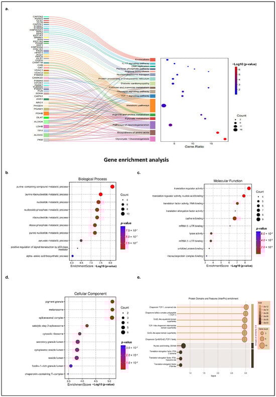 Pathway and gene ontology enrichment analysis of the CHIKV-nsP3 interacting partner: (a) Sankey and the dot plot of the core metabolic proteins and their pathways, with the cellular processes involved plotted with the help of SRplots (SRplot: a free online platform for data visualization and graphing). (b) GO enrichment analysis of crucial biological processes associated with CHIKV-nsP3 interacting proteins. The color of the circles denotes the enrichment significance p-value, and the size of the circle represents the number of genes in the functional category. (c) GO enrichment analysis of the molecular functions associated with CHIKV-nsP3 interacting proteins. (d) GO enrichment analysis of the cellular components of the CHIKV-nsP3 interacting proteins. (e) The protein domain associated with the host proteins based on the maximum FDR value ≤ 0.05 and minimal signal strength ≥ 0.01 using STRING 12.0.