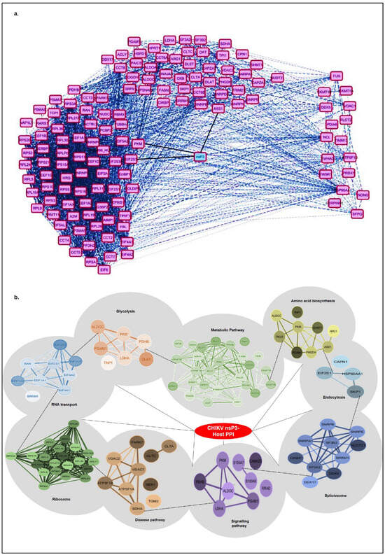 CHIKV-nsP3 host protein–protein interaction network derived from Co-IP and LC-MS/MS-based studies. (a) This network visualizes host proteins that interact directly or indirectly with the chikungunya virus (CHIKV) nonstructural protein 3 (nsP3), identified through Co-IP experiments in Huh7 human hepatoma cells. The central, cyan-colored node represents nsP3, while magenta nodes represent host proteins. Solid black edges indicate novel interactions from the current study between nsP3 and host proteins detected with high confidence. Dashed grey edges denote additional host–host interactions mapped from known protein–protein interaction databases (STRING). The dense connectivity on the left indicates ribosomal and translation-related factors clustering, suggesting that CHIKV nsP3 may interact with or co-opt host translation machinery. Nodes on the right are more loosely connected and may represent nuclear or stress granule-associated proteins. The network layout was optimized for visualization clarity. (b) Pathway target networks (P-T network): A network constructed from significant pathway enrichment results connecting different human protein pathways with the CHIKV-nsP3 protein present at the center. The significant pathways are present in the form of different clusters (around the CHIKV-nsP3 protein). The pathways are connected with the help of dashed edges, while the 8 edges in the centre connect with the virus CHIKV-nsP3 protein. The host proteins are present in the form of colored nodes according to their significant pathways. While the edges represent the strength of interaction (the thicker edges represent significant interactions amongst the proteins). The networks were obtained with default settings for a full STRING network, displaying edges in high-confidence mode with a minimum interaction score of 0.7; a maximum FDR ≤ 0.05; and a minimum strength ≥ 0.01 and displaying no disconnected nodes.