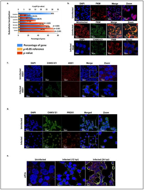 To validate in silico predictions of host protein localization during uninfected and CHIKV-infected states, we employed confocal microscopy to examine some of the key interacting host proteins, namely, argininosuccinate synthase 1 (ASS1), pyruvate kinase M (PKM), eukaryotic translation initiation factor alpha subunit (eIF2α), and peroxiredoxin 1 (PRDX1). CHIKV E1 protein was used as a marker to confirm the infection status within cells. We first focused on the subcellular localization of pyruvate kinase M (PKM), evaluating its co-localization with mitochondria using MitoTracker Red and with nuclei stained by DAPI. In uninfected cells, PKM was observed in the cytosol, mitochondria, and nucleus (Figure 4b, first and second panels), whereas at 12 hpi, it was restricted to the cytosol (Figure 4b, third panel). Next, we examined ASS1 in Huh7 cells, finding it consistently localized to the cytosol in both uninfected and infected conditions (Figure 4c). Peroxiredoxin was similarly confined to the cytosol under both conditions. However, a low expression of peroxiredoxin 1 was also seen in the nucleus during the uninfected condition (Figure 4d). A temporal localization analysis of host translation initiation factor eIF2α at 12 hpi and 24 hpi revealed a dynamic subcellular redistribution of the protein. At 12 hpi, eIF2α was predominantly localized in the cytosol (Figure 4e); however, by 24 hpi, the protein exhibited a marked translocation to the nucleus, with a concomitant reduction in cytosolic presence. This temporal shift in eIF2α localization suggests a virus-induced modulation of host translational control mechanisms, potentially contributing to the cellular stress response during CHIKV replication.