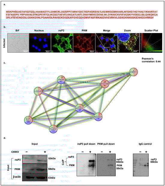 Virus-infected cells often exhibit elevated carbon metabolism to support viral replication or fuel host antiviral responses. Pyruvate kinase M (PKM), a key glycolytic enzyme catalyzing the conversion of phosphoenolpyruvate (PEP) to pyruvate and ATP, was identified as a high-confidence CHIKV-nsP3 interacting protein in our mass spectrometry dataset, with 19 unique peptides detected (Figure 5a). To validate this interaction, we first examined the spatial distribution of PKM and nsP3 in CHIKV-infected Huh7 cells (MOI 1, 12 hpi) using immunofluorescence. Confocal microscopy revealed the cytosolic co-localization of nsP3 and PKM, with a Pearson’s correlation coefficient of 0.44, indicating a moderate degree of spatial overlap (Figure 5b). Next, we generated a STRING network of the pyruvate metabolism pathway, which revealed a significant protein–protein interaction (PPI) enrichment, comprising 8 nodes and 20 edges. The network included key glycolytic enzymes identified in our proteomic screen, such as PKM, TPI1, ALDOA, and ALDOC, highlighted by high-confidence annotations from KEGG, Reactome, and Wiki Pathways with a signal strength of 1.93 and an FDR of 6.40 × 10−9 (Figure 5c). Finally, to confirm a direct physical interaction between PKM and nsP3, we performed co-immunoprecipitation (Co-IP) assays using CHIKV-infected Huh7 lysates collected at 12 hpi. An immunoblot analysis confirmed the expression of PKM and nsP3 at their expected molecular weights (58 kDa and 65 kDa, respectively), with uninfected lysates serving as negative controls (Figure 4d, first blot). The Co-IP results demonstrated a robust interaction between PKM and nsP3, validating our mass spectrometry findings (Figure 5d, second and third blots), with IgG serving as a negative control (fourth blot).