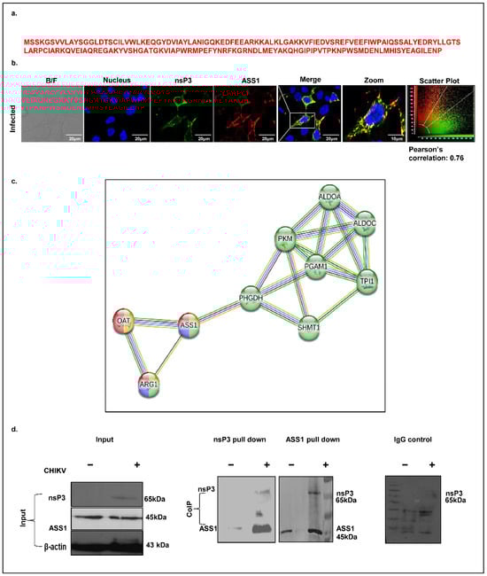 CHIKV-nsP3 protein interacts with ASS1. (a) Peptide sequence of ASS1 identified through mass spectrometry. (b) IFA showed colocalization of ASS1 with CHIKV-nsP3 at 12 hpi (at MoI of 1.0). Immunostaining was carried out with antibodies against CHIKV-nsP3 (green) and ASS1 (red) and respective Alexa Fluor secondary 488 (mice) and Alexa Fluor 594 (rabbit) secondary antibodies. The nucleus was visualized with DAPI (blue). Images were taken using the confocal microscope. A scale bar of 20 μm was used. (c) The STRING network represents the host proteins involved in Amino acid biosynthesis and metabolism. Nodes represent the host proteins, and edges represent the association between the proteins based on similarity in functions. Filled nodes denote the prediction of the 3D structure of the specific protein. Light blue and purple edges represent the known interactions that have been experimentally validated, whereas green, red, and dark blue denote the predicted interactions. (d) Immunoblotting image showing the direct interaction between ASS1 and CHIKV-nsP3 during infection. Uninfected and infected Huh7 cells cell lysates were prepared 12 h post-infection and used for the Co-IP experiment. The first immunoblot represents 10% of the cellular lysate (input) used for Western blotting, and β-actin was used as a loading control. The second and third immunoblots are the co-immunoprecipitation analysis showing the interaction of CHIKV-nsP3 protein with ASS1 using the nsP3 and ASS1 antibodies. The fourth immunoblot represents the negative control, where rabbit IgG was used to immunoprecipitate the protein complex and was probed with the anti-nsP3 antibody.