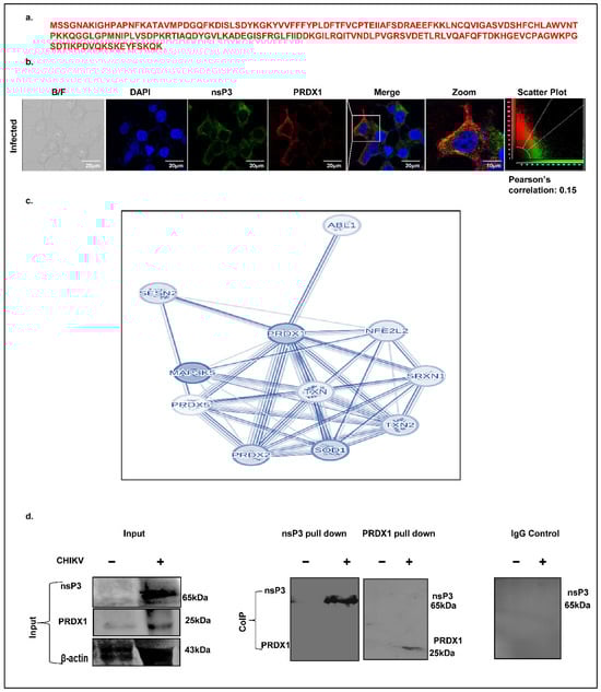 One of the crucial molecular functions associated with the CHIKV-nsP3-identified interacting partners in the current study is peroxidase activity, and the protein involved includes peroxiredoxin (PRDX1), with unique peptides equal to three and a peptide sequence represented in Figure 7a. As a first step, we checked for the co-localization pattern of the two proteins, i.e., CHIKV-nsP3 and PRDX1, using an immunofluorescence assay. The result showed that the two proteins were colocalized together in cytosol but the colocalizing signal was minimal, with a Pearson coefficient of 0.15 (Figure 7b). Further, we generated a STRING network for the proteins associated with peroxidase activity using high-confidence criteria of 0.7 in the STRING setting, represented in Figure 7c. As a final validating step, we performed Co-IP to investigate the direct interaction of the two proteins. However, our attempts to pull down endogenous oxidative stress scavenger protein peroxiredoxin (PRDX1) in CHIKV-infected cells using the anti-nsP3 antibody, or vice versa, were not successful (Figure 7d).