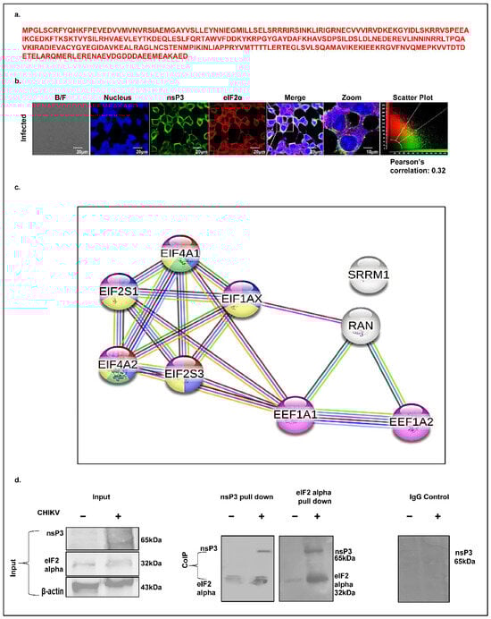 Eukaryotic translation initiation is tightly regulated by multiple eukaryotic initiation factors (eIFs), among which eIF2α (EIF2S1) plays a central role. A mass spectrometry analysis identified eIF2α as a CHIKV-nsP3-interacting host factor, supported by the presence of three unique peptides (Figure 8a). Given that eIF2α phosphorylation is a central event in stress response and translation inhibition, we examined its spatial association with CHIKV-nsP3. A confocal immunofluorescence analysis of CHIKV-infected Huh7 cells (12 hpi, MOI 1) revealed limited cytosolic co-localization between eIF2α and nsP3, with a Pearson correlation coefficient of 0.30 (Figure 8b). To contextualize eIF2α within the broader translation regulatory network, we generated a high-confidence STRING interaction map (confidence score ≥ 0.7). The resulting network, enriched for protein–protein interactions, comprised 9 nodes and 18 edges, including key translation factors such as EIF2S1, EIF2S3, EIF4A1, EIF4A2, and EIF1AX (Figure 8c). To validate this interaction biochemically, we performed co-immunoprecipitation of nsP3 and eIF2α from CHIKV-infected cell lysates at 12 hpi, followed by a immunoblot analysis. The results confirmed a association between nsP3 and eIF2α during infection (Figure 8d), reinforcing its potential role in modulating host translation pathways to favor viral replication.