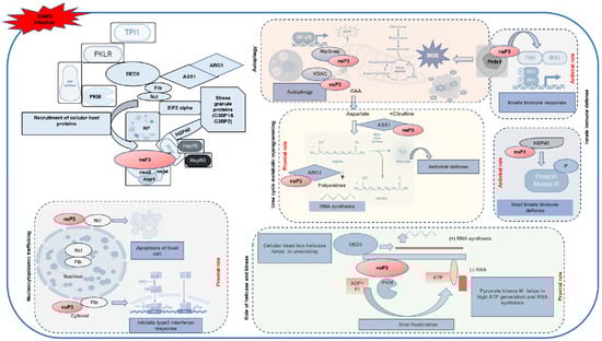 Taking all the evidences obtained in the analyses performed in this study, we generate a hypothetical working model of the roles of the identified host interacting partners in the CHIKV life cycle (Figure 9). At the core of the model, CHIKV infection triggers the recruitment of host proteins by nsP3, a multifunctional viral protein known to orchestrate replication and host manipulation []. CHIKV-nsP3 is known to participate, along with other CHIKV nonstructural proteins (nsP1, nsP2, and nsP4), within the replication complex, in forming a hub for viral RNA synthesis. Host proteins such as nucleolin (Ncl) and fibrillarin (Fib) are recruited from the nucleus to the cytosol, a process indicative of nucleo-cytoplasmic shuttling. Nucleolin has been implicated in viral infections, such as SARS-CoV-2, where it interacts with viral proteins to induce apoptosis via p53 []. Similarly, fibrillarin aids viral entry in macrophages by suppressing type I interferon (IFN) responses []. In CHIKV infection, these nucleolar proteins may inhibit type I IFN responses, as shown in the model, thereby facilitating viral replication by dampening host antiviral defenses. The model further illustrates CHIKV’s impact on mitochondrial dynamics, with nsP3 interacting with proteins like VDAC, NIPSNAP, and those involved in the TCA cycle (e.g., succinate dehydrogenase and ATP citrate lyase). These interactions disrupt mitochondrial homeostasis, leading to increased ROS production and altered energy metabolism, which support viral replication while impairing antiviral signaling via MAVS []. VDAC’s role in viral infections, such as dengue and Japanese encephalitis virus (JEV), involves altering mitochondrial membrane potential [,]. The model also indicates that nsP3 induces autophagy, a process that may degrade host antiviral proteins, further facilitating viral persistence. Furthermore, our data suggest that CHIKV-nsP3 interacts with heat shock proteins (HSP40, HSP70, and HSP90) and protein kinase R (PKR), modulating cellular stress responses. HSP40, previously identified as a CHIKV interactor in macrophages [], mediates PKR signaling, a critical regulator of host defense, as seen in influenza virus infections [], suggesting that these interactions help CHIKV evade PKR-mediated antiviral responses, promoting viral replication.