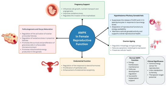 As a key enzyme of energy metabolism, AMPK responds to fluctuations in intracellular energy levels by modulating various physiological processes, including glucose uptake, lipid metabolism and mitochondrial function. The properties of AMPK as an energy sensor enable it to couple with the energy status of reproductive function []. In recent years, there has been increasing evidence that AMPK plays an important role in the female reproductive system, where it influences ovarian function, uterine receptivity, and overall reproductive longevity []. AMPK is widely distributed in reproductive tissues, including the ovaries and uterus, where it regulates reproductive processes such as folliculogenesis, ovulation, implantation, and decidualisation []. By responding to metabolic stress and energy availability, AMPK integrates systemic metabolic cues with reproductive function to ensure optimal conditions for fertility. The dysregulation of AMPK signalling has been implicated in reproductive disorders such as PCOS, premature ovarian failure, and endometrial dysfunctions, highlighting its importance in female reproductive health. Understanding the role of AMPK in reproductive physiology may provide valuable insights into the potential therapeutic targets for reproductive disorders.