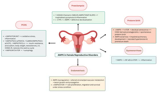 The AMP-activated protein kinase (AMPK) signalling pathway has been shown to be a central regulator of female reproductive physiology, closely linking cellular energy homeostasis to reproductive function. It plays a central role in critical reproductive processes such as folliculogenesis, oocyte maturation, the maintenance of pregnancy, and placental development. Its involvement in the reproductive system emphasises its importance in maintaining reproductive health. The dysregulation of AMPK signalling is increasingly recognised as a contributing factor to a spectrum of female reproductive disorders such as polycystic ovary syndrome (PCOS), endometriosis, infertility, and reproductive ageing, primarily through the disruption of metabolic and inflammatory balance. This review highlights the potential of targeting AMPK to restore physiological balance and treat these complex diseases. A better understanding of the multiple functions of AMPK could offer a promising pathway for novel interventions aimed at preventing and treating female reproductive dysfunction to ultimately improve fertility and enhance women’s reproductive wellbeing.