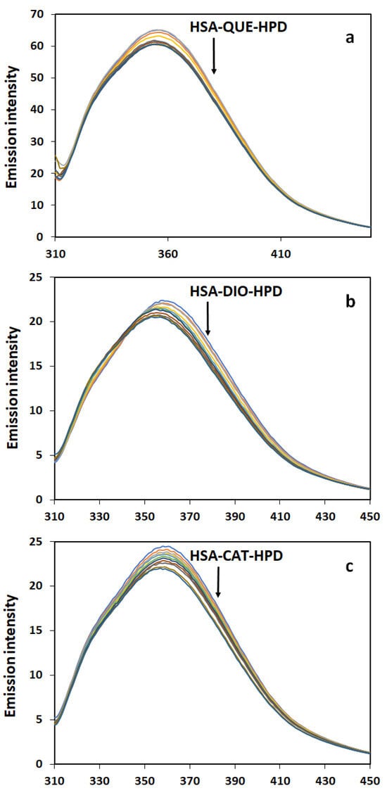 3.4. Fluorescence Spectra of Haloperidol Binding with HSA in the Absence or Presence of Flavonoids