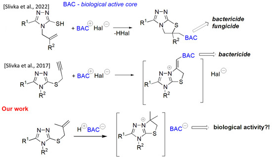 In our previous studies, we obtained fused 1,2,4-triazoles [20,21,22] via a low-cost and efficient electrophilic cyclization methodology [15] that also allows for introducing pharmacophore fragments of various natures into the target molecule. We have used biologically active core (BAC) as an electrophile in these syntheses, which allows us to introduce BAC into a fused heterocyclic system and receive bioactive samples (Figure 1).