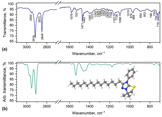 (a) Experimental FTIR spectra of compound 2d and (b) theoretical IR spectra of cation 6,6-dimethyl-2-pentadecyl-3-phenyl-5,6-dihydro-3H-[1,3]Thiazolo[3,2-b][1,2,4]triazol-7-ium, calculated at the B3LYP/ma-def2-TZVP level of theory and scaled for 0.965. The optimized structure is shown as an inset.