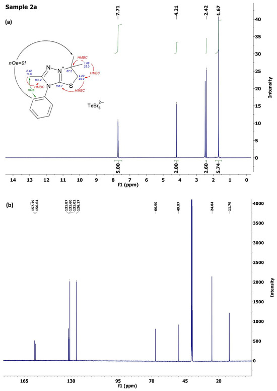 Protons of the endocyclic S-CH2 group of salts 2a–e are detected as a singlet at region 4.15–4.22 ppm, with an intensity of 2, for example, at 4.21 ppm for salt 2a (Figure 3a). The signals of all protons of alkyl/phenyl were found and identified in the 1H NMR spectra of compounds 2a–e. The spectral 13C NMR data (Figure 3b) also fully correlate with the structure assigned by us for salts 2a–e. Thus, the signal of the thiazoline nodal C-6 and C-5 signals of the thiomethylene group of the [1,3]Thiazolo[3,2-b][1,2,4]triazol-7-ium cation in the abnormally weak region (at 66.1–67.1 ppm and at 48.7–50.0 ppm, accordingly) indicates the quaternization of the neighboring nitrogen atom, which occurs during the annellation of the thiazoline ring. The location of the carbon atoms’ signals from the triazole ring at 156.1–156.6 and 157.2–157.4 ppm also proves the formation of condensed [1,3]Thiazolo[3,2-b][1,2,4]triazol-7-ium salts 2a–e. For salt 2a (Figure 3b), the signals in the strong region at 11.8 ppm and 24.8 belong to methyl groups near C-2 in the triazole ring and near the C-6 nodal carbon, respectively, which fully confirms the assigned structure of compound 2a.