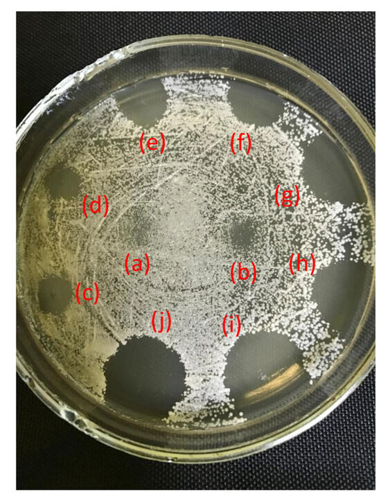 Preliminary evaluation of compound 2a for antifungal action. Zones were produced into Candida albicans ATCC 885–653 lawns by compound 2a applied onto and absorbed in Sabouraud agar in the periphery of the Petri dish as 20 µL drops at concentrations (a) 15.63, (b) 31.25, (c) 62.5, (d) 100, (e) 125, (f) 150, (g) 200, (h) 250, (i) 500, and (j) 750 µg/mL in advance of yeast suspension 106 CFU/mL inoculation.