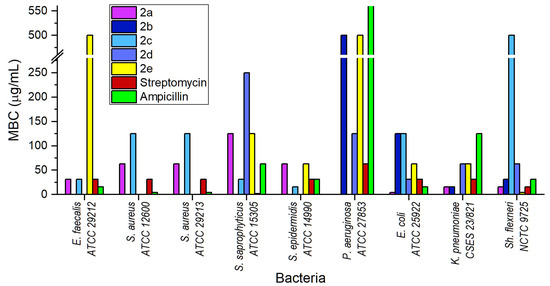 Similarly to streptomycin and ampicillin, the MBC/MIC ratios were not higher than 4 for compounds 2a, 2c, and 2d in all Gram-negative bacteria that were sensitive to them in our study. This proved the bactericidal action of these compounds and antibiotics on such bacteria. The compounds 2b and 2e had MBC/MIC ratios equal to 8 (more than 4) for K. pneumoniae CSES 23/821 and E. coli ATCC 25922, suggesting bacteriostatic action against these strains. The compounds 2b and 2e, with MBC/MIC ratios less than 4, demonstrated bactericidal effects on Shigella flexneri NCTC 9725 at low concentrations and against P. aeruginosa ATCC 27,853 at high concentrations. The latter bacterium was insensitive to 2a, 2c, and ampicillin and was the least sensitive bacterium among the strains tested against our compounds (Table 3).