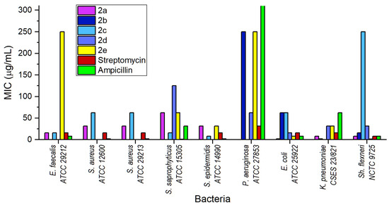 The MBC and MIC of 2d were 4 times higher than those of streptomycin. The compound 2e demonstrated the strongest action against Shigella flexneri NCTC 9725 with MBC 3.9 and MIC 1.95 µg/mL. These antimicrobial doses were several times lower than those of streptomycin and ampicillin (Table 3, Figure 5 and Figure 6).