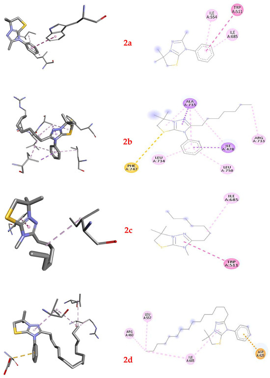Comparing the docking results for ligands 2a, 2b, 2c, and 2d interacting with the UafA protein from Staphylococcus saprophyticus, we observed some particularities. Cation 2b exhibited the highest docking affinity (−6.8 kcal/mol) and a mix of π–σ, π–sulfur, alkyl, and π–alkyl interactions with the protein residues. Ligand 2a followed with an affinity of −6.0 kcal/mol, predominantly forming alkyl interactions with hydrophobic residues, with one π–π T-shaped interaction. Cation 2c scored a binding affinity of −5.3 kcal/mol, forming two non-covalent bonds—a π–π T-shaped interaction and an alkyl interaction. Finally, ligand 2d (−5.1 kcal/mol) formed hydrophobic alkyl interactions with the protein residues, with an additional electrostatic π–anion interaction.