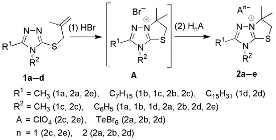 2.1. Synthesis of [1,3]Thiazolo[3,2-b][1,2,4]triazol-7-ium Salts 2a–e